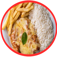 Filé de frango à milanesa, mussarela, molho,batata frita ou purê de batata e arroz